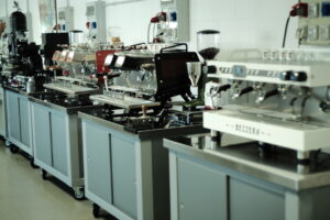 細長いショールームにずらりと鎮座するエスプレッソマシンたち。