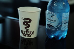 ベゼラのおっちゃんがお土産にとEZZERAのロゴ入りエスプレッソカップとポロシャツをくれました。